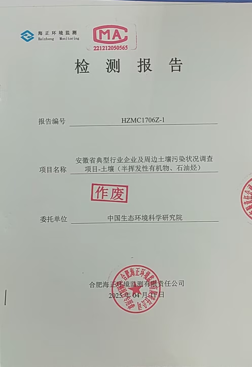 關(guān)于對委托單位:中國生態(tài)環(huán)境科學(xué)研究院,項目編號:HZMC1706Z-1檢測報告作廢(作廢時間2025年4月11日)的公示